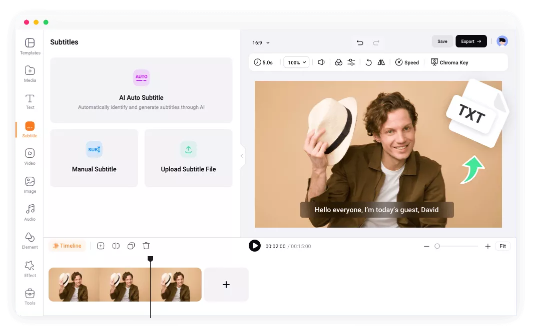 我們的影片編輯器採用尖端的自動語音識別技術,幫助您輕鬆獲得影片內容並精確轉錄。對於內容創作者、企業、教育工作者以及任何其他需要精確的影片轉錄功能的用戶來說,此功能都提供了很大的便利。
